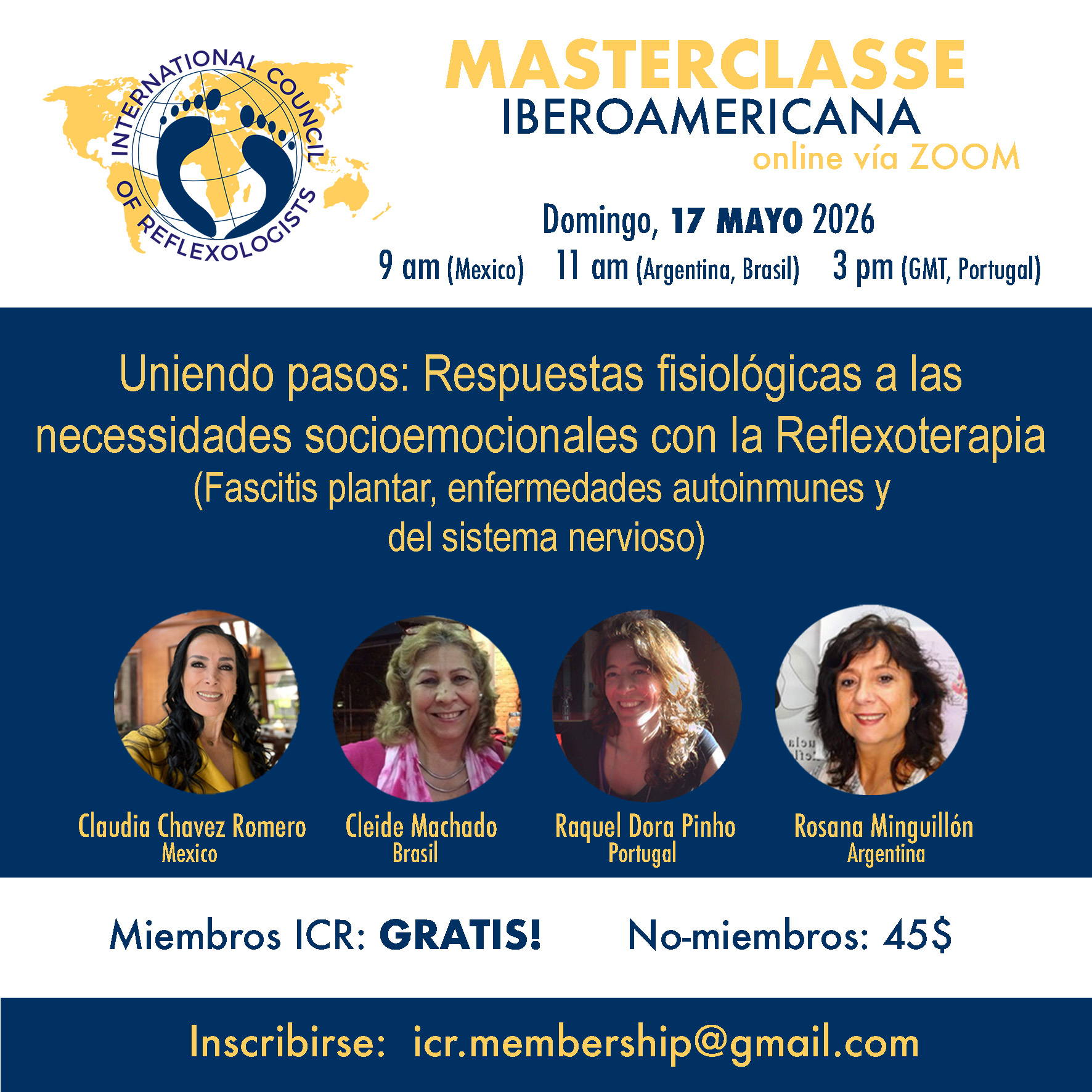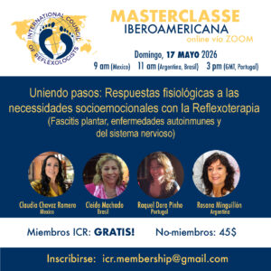ICR ONLINE PRESENTATIONS INTERNATIONAL COUNCIL OF REFLEXOLOGISTS 17 Mayo 2026 09h00 (Mexico) 11h00 (Argentina/Brasil) 15h00 (GMT/Portugal) Las inscripciones se abren el 1 de abril de 2026. Non-Miembros : US$45 Miembros: Gratis Haz clic en los enlaces de abajo para registrarte